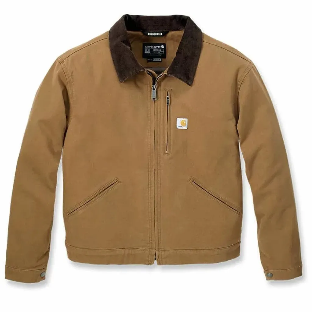 Χαρακτηριστικά: Σύνθεση από 98% βαμβάκι/2% ελαστάνη και 8.5 oz/yd² – 288 gsm. Ενσωματώνοντας την τεχνολογία Rugged Flex™, αυτό το σακάκι σας εξασφαλίζει την ελευθερία κινήσεων που χρειάζεστε χωρίς συμβιβασμούς στην αντοχή. Φτιαγμένο για ελαφρώς χαλαρή εφαρμογή που προσφέρει βέλτιστη άνεση και λεπτό σχήμα για μεγάλο εύρος κίνησης, αυτό το σακάκι έχει μήκος που πέφτει ακριβώς κάτω από τη μέση. Διαθέτει εσωτερική επένδυση: Stretch Twill επένδυση με στάμπα κουβέρτας, γιακά με επένδυση από κοτλέ, τσέπη στο στήθος καθώς και δύο κάτω μπροστινές τσέπες με φερμουάρ και δύο εσωτερικές. Ρυθμιζόμενες μανσέτες με κουμπιά και Ετικέτα Carhartt μπροστά.